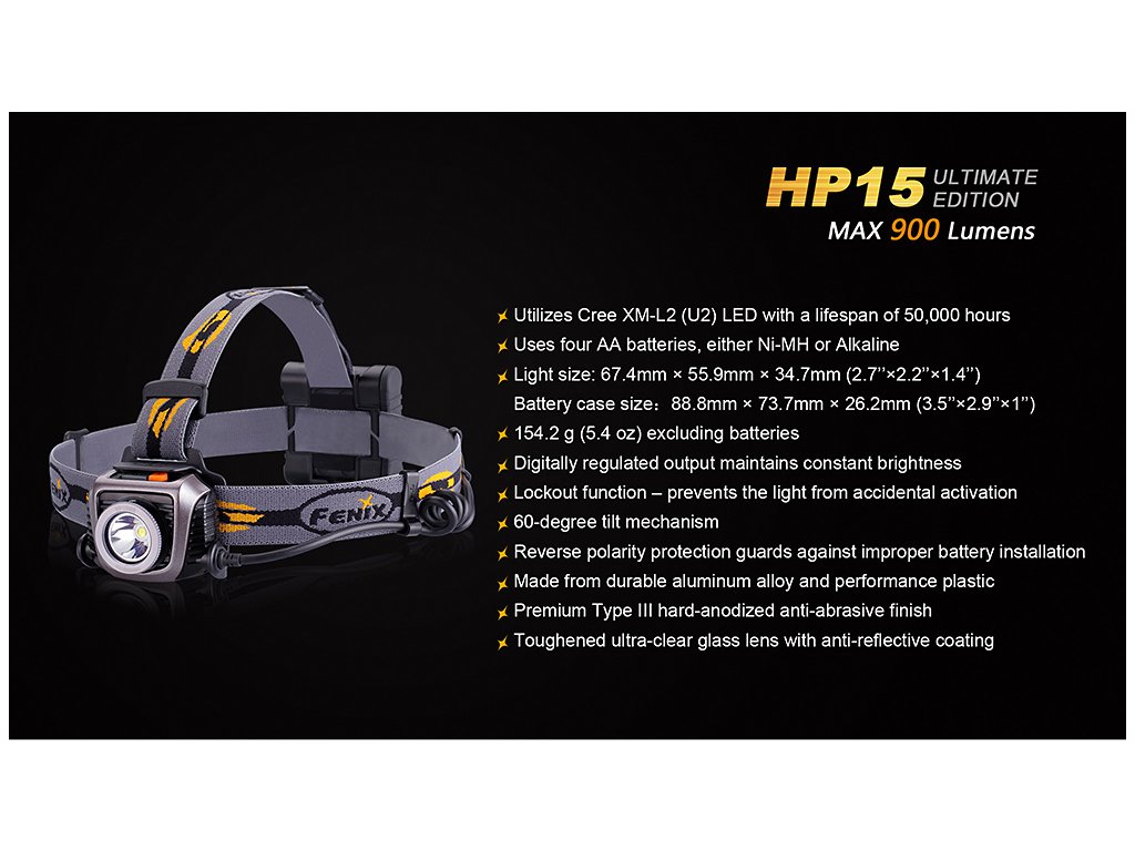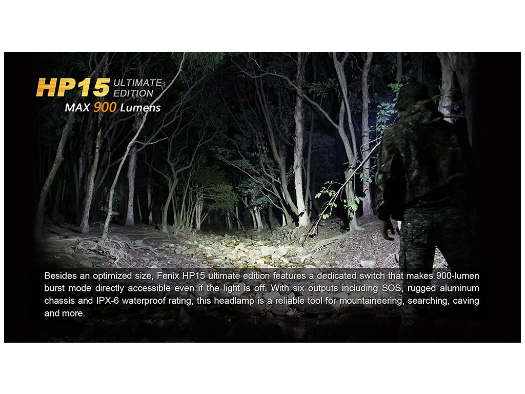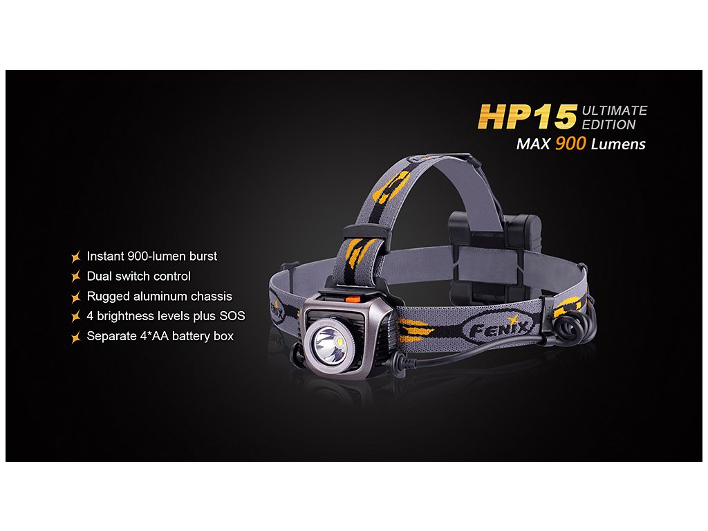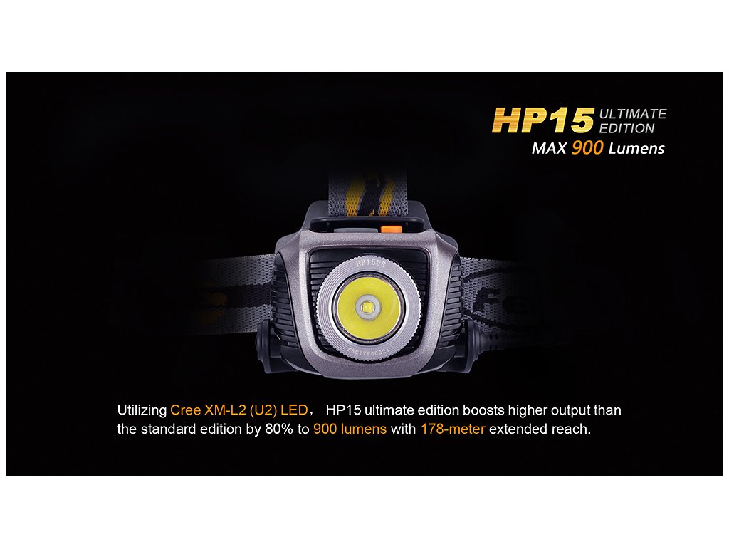 LED čelovka Fenix HP15 Ultimate Edition nabízí bezkonkurenční výkon až 900 lumenů a dosvit až 178 metrů. K napájení používá čtyři tužkové AA baterie, které jsou umístěny v pouzdře na zátylku. Výborného výkonu bylo dosaženo použitím nejnovější LED Cree XM-L2. Jedná se tak o nejsilnější čelovou LED svítilnu na tužkové baterie na trhu! Nabízí celkem 6 režimů svícení včetně SOS signálu a výbornou výdrž až 170 hodin. HP15 Ultimate je zvláště vhodná pro běžecké lyžování, noční běh, cyklistiku, speleologii, rybaření a další aktivity.