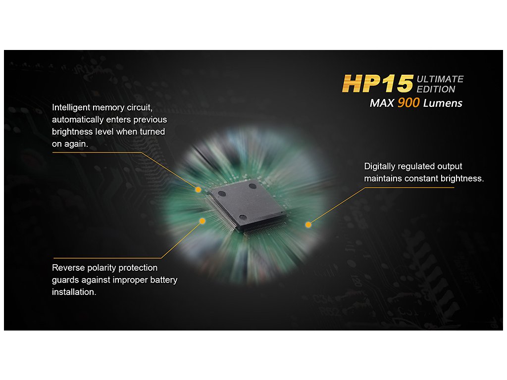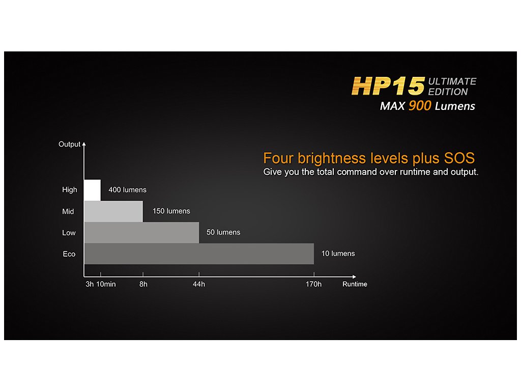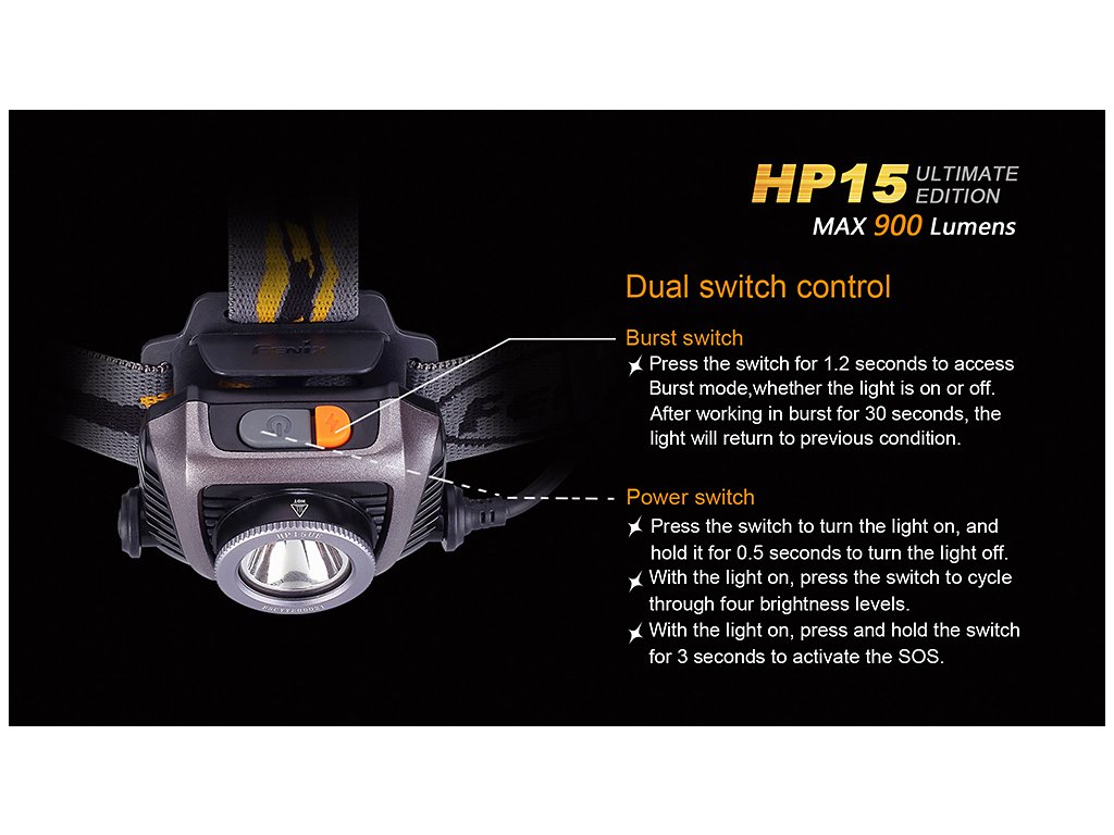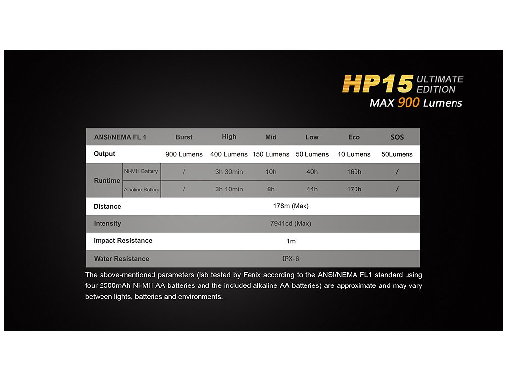LED čelovka Fenix HP15 Ultimate Edition nabízí bezkonkurenční výkon až 900 lumenů a dosvit až 178 metrů. K napájení používá čtyři tužkové AA baterie, které jsou umístěny v pouzdře na zátylku. Výborného výkonu bylo dosaženo použitím nejnovější LED Cree XM-L2. Jedná se tak o nejsilnější čelovou LED svítilnu na tužkové baterie na trhu! Nabízí celkem 6 režimů svícení včetně SOS signálu a výbornou výdrž až 170 hodin. HP15 Ultimate je zvláště vhodná pro běžecké lyžování, noční běh, cyklistiku, speleologii, rybaření a další aktivity.