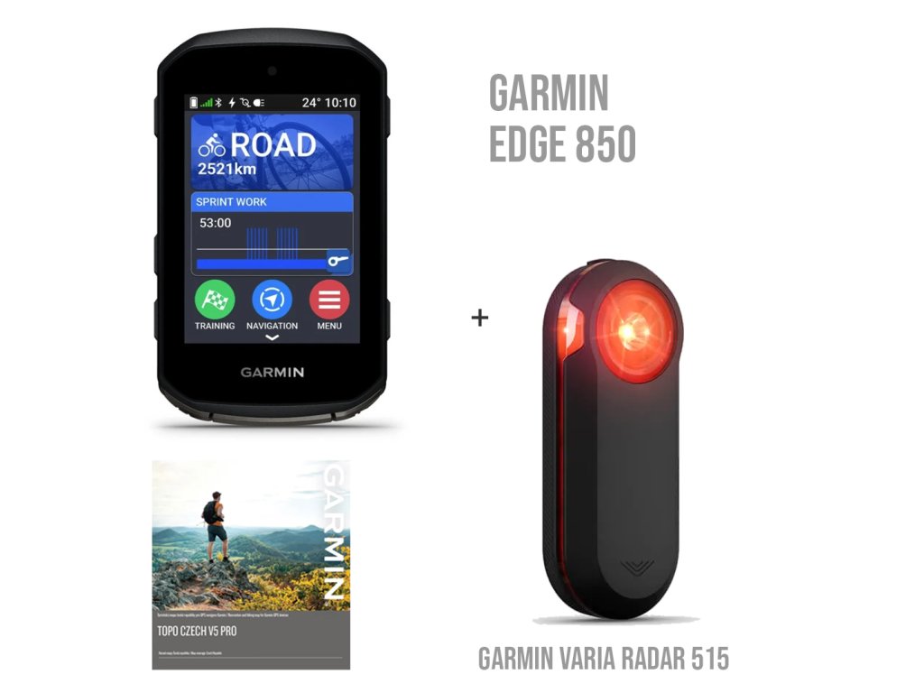 Výhodný set sportovní navigace Garmin Edge 850 a cyklistický radar se zadním světlem Garmin Varia radar 515.