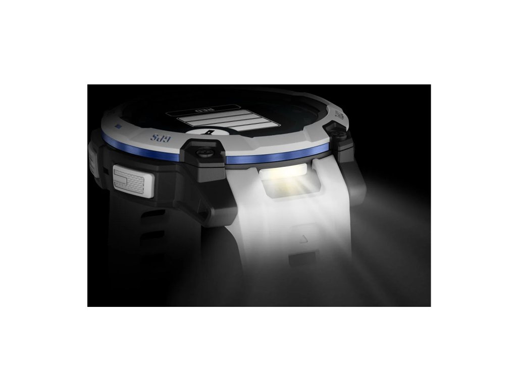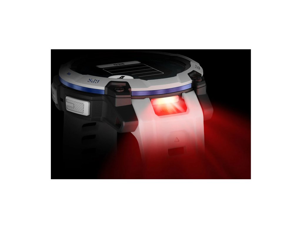 V pouzdře hodinek se ukrývá výkonná LED svítilna s nastavitelným jasem v několika úrovních a světlem bílé nebo červené barvy.