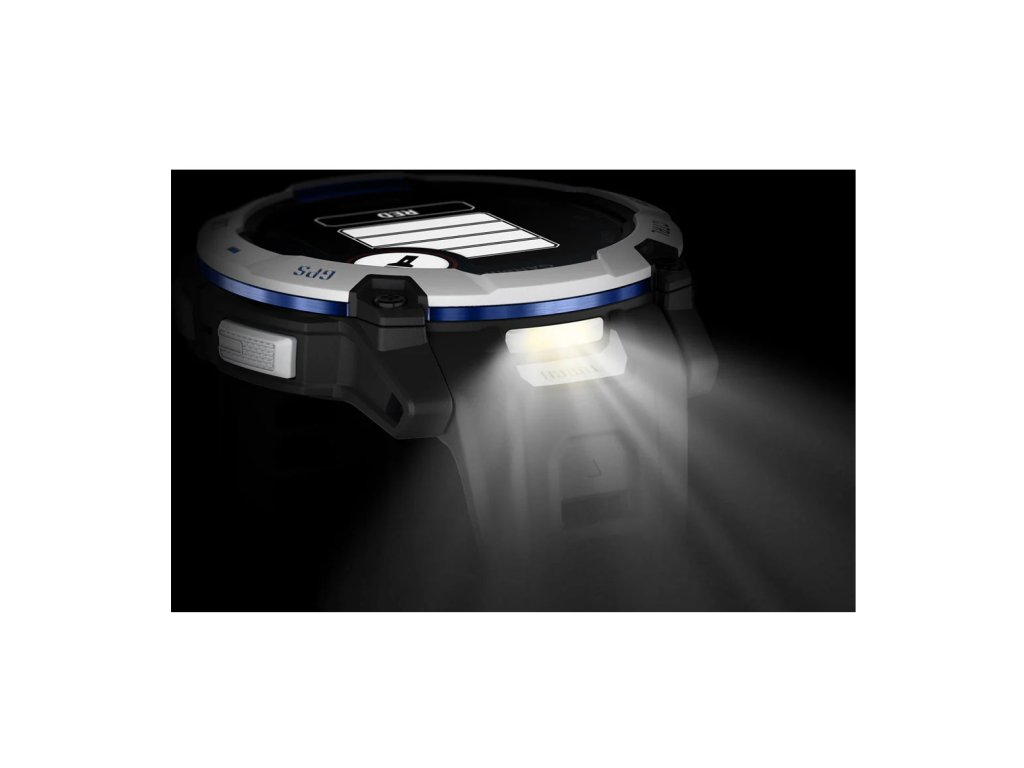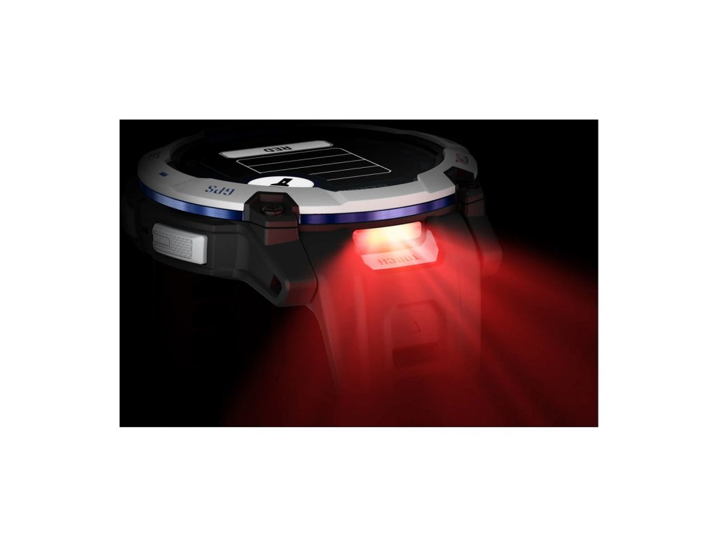 V pouzdře hodinek se ukrývá výkonná LED svítilna s nastavitelným jasem v několika úrovních a světlem bílé nebo červené barvy.