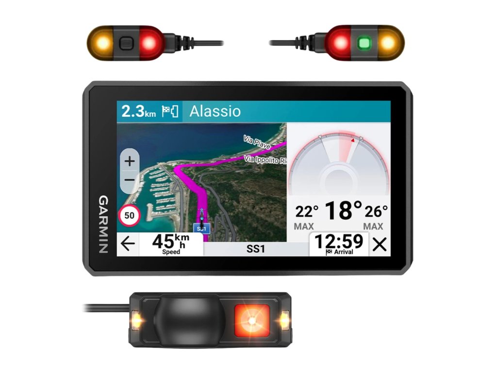 Spárujte navigaci s radarovým systémem zūmo™ R1 (prodává se samostatně) a využijte pohled dozadu a sledování mrtvého úhlu. Díky externím světlům vás ostatní účastníci silničního provozu lépe uvidí. Systém navíc dokáže zobrazit okolní vozidla přímo na displeji navigace.