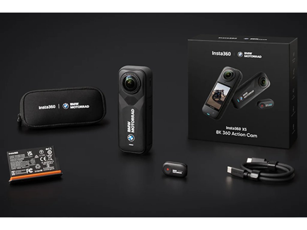 Akční 360° kamera Insta360 X5 se snímačem 1/1.28" a triple AI čipem. Rozlišení 360° videa až 8K/30fps, při 4K až 120 fps. Foto rozlišení 72 Mpx. Vodotěsnost do 15 m, 6osá stabilizace FlowState, bitrate 180 Mbps, vylepšený noční režim. Ultra baterie 2800 mAh s výdrží až 235 min. Nabízí InstaFrame mód pro okamžité sdílení, vylepšený zvuk s novou vestavěnou ochranou proti větru. Má odolné a vyměnitelné čočky. Rozměr kamery 46 x 124,5 x 38,2 mm. Součástí balení je mini dálkové ovládání s logem BMW, Ultra baterie 2800 mAh, přenosné pouzdro, USB C/C kabel, hadřík na čištění čoček, nálepky na čištění.