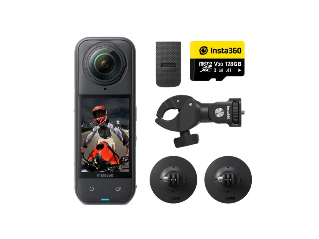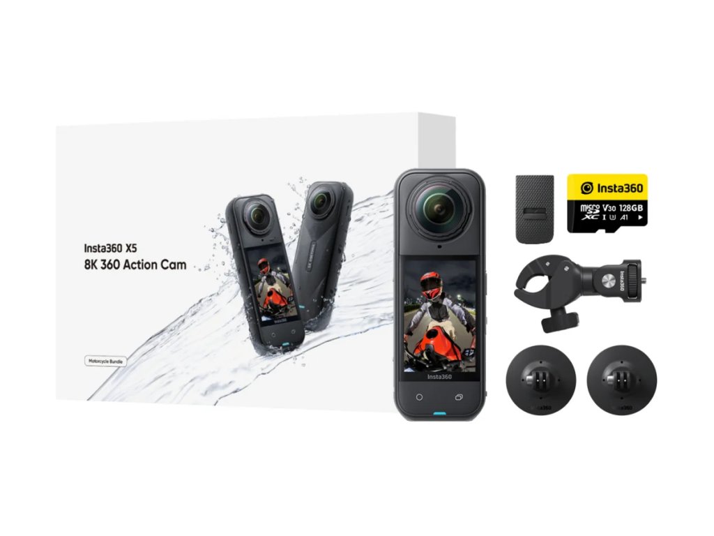 Akční 360° kamera Insta360 X5 se snímačem 1/1.28". Rozlišení 360° videa až 8K/30fps, při 4K až 120 fps. Foto rozlišení 72 Mpx. Vodotěsnost do 15 m, 6osá stabilizace FlowState, bitrate 180 Mbps, vylepšený noční režim. Baterie 2400 mAh s výdrží až 185 min. Nabízí InstaFrame mód pro okamžité sdílení, vylepšený zvuk s novou vestavěnou ochranou proti větru. Má odolné a vyměnitelné čočky. Rozměr kamery 46 x 124,5 x 38,2 mm. Součástí balení je akční kamera Insta360 X5, Paměťová karta 128 GB, Svorka Heavy duty Clamp, Protiskluzový kroužek ×8, Imbusový klíč ×1, Adaptér z 1/4" na 2-kolíkový konektor ×2, Adaptér pro upevnění kamery 1/4" ×1, Šroub s hlavicí (thumb screw) ×3, Klíč na upevňovací svorku ×1, Insta360 X5 All-Weather USB krytka, přenosné pouzdro, USB C/C kabel, hadřík na čištění čoček, nálepky na čištění.