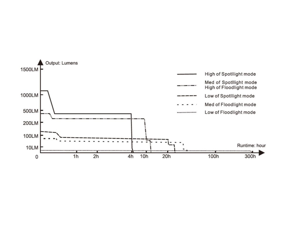 - Při delším použití jednotlivých světelných režimů čelovka postupně snižuje výkon v malých krocích pro dosažení delší doby svícení.