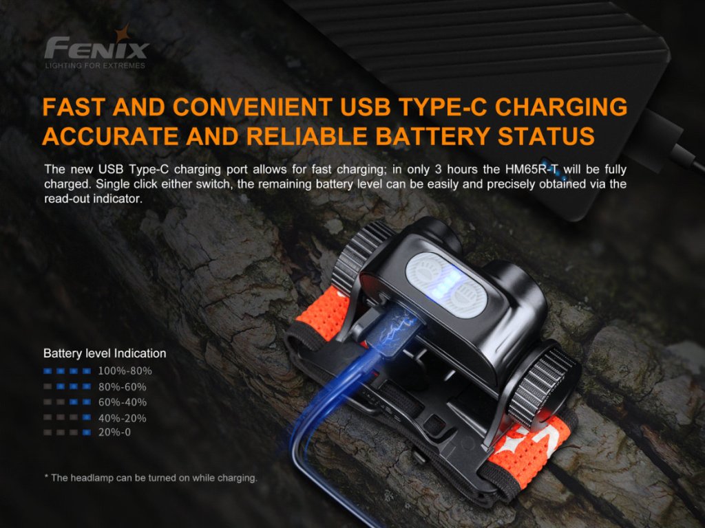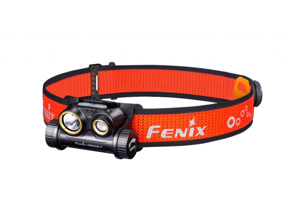 Nabíjecí čelovka Fenix HM65R-T se vyznačuje konstrukcí z lehké magnéziové slitiny, vysokou odolností proti vodě i pádu, unikátní konstrukcí se dvěma reflektory a celkovým výkonem až 1500 lumenů. Jeden reflektor vytváří dobře zaostřený světelný paprsek s dalekým dosvitem a druhý reflektor má světelnou stopu velmi širokou a plynulou. Světelný tok dálkového reflektoru je až 1300 lumenů, reflektor s širokým kuželem nabízí maximální výkon 400 lumenů a neutrální odstín světla. Ovládání obou LED je na sobě nezávislé, světlo z obou reflektorů lze libovolně kombinovat a dosáhnout tak světelného toku až 1500 lumenů (při zapnutí obou reflektorů najednou je jejich max. výkon 1150 + 350 lumenů). Oba dva světelné zdroje, dálkový i široký, nabízejí tři režimy svícení. K napájení slouží jeden Li-ion akumulátor, který je součástí balení a nabíjí se přes moderní USB-C konektor přímo v čelovce. V případě nouze lze čelovku napájet i dvěma jednorázovými bateriemi CR123A.