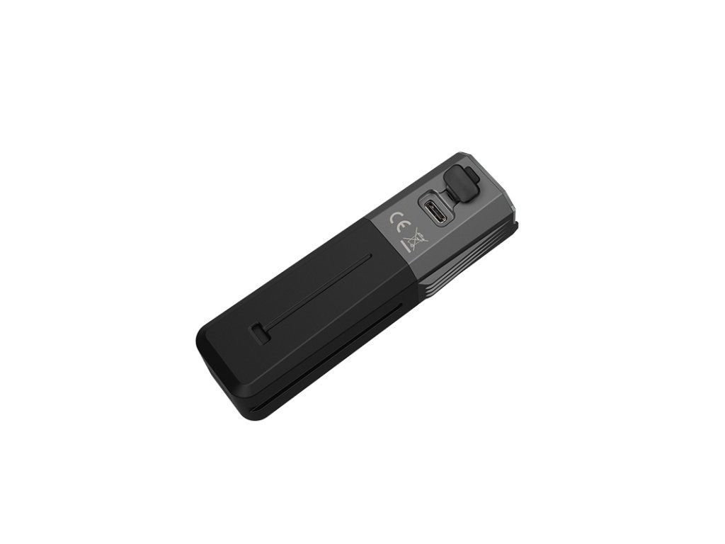 - Odklopte gumovou krytku USB-C konektoru na spodní straně svítilny a pomocí přiloženého USB kabelu ji zapojte do počítače, powerbanky, síťového USB adaptéru nebo USB adaptéru do auta.