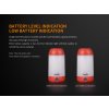 Indikace stavu nabití baterie – po krátkém stisku tlačítka (lucerna musí být vypnutá) se aktivuje LED indikátor stavu nabití baterií nad ovládacím tlačítkem. Čtyři rozsvícené LED znamenají, že baterie je nabitá na více než 80%, tři rozsvícené 60-80%, dvě 40-60%, jedna 20-40% a jedna blikající značí že baterie je nabitá na méně než 20%.
