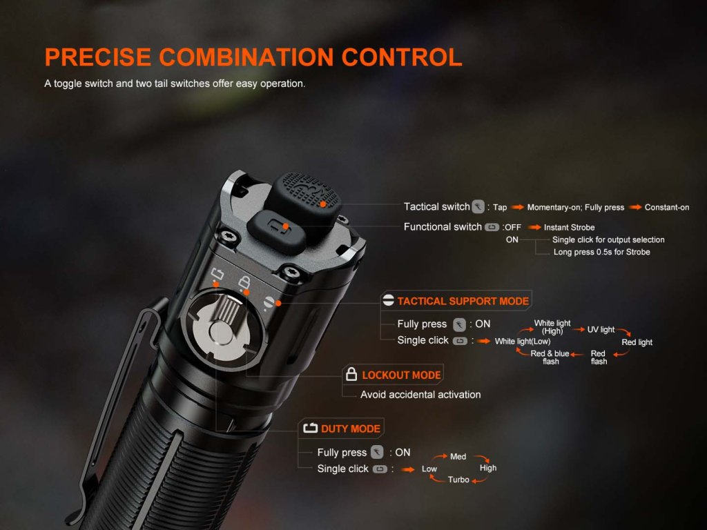 Pro zapnutí zmáčkněte hlavní taktický spínač na konci svítilny, pro okamžitou aktivaci ho namáčkněte. Stiskem vedlejšího přepínacího tlačítka můžete posléze cyklicky přepínat mezi režimy svícení zvoleného reflektoru. Turbo režim 3600 lumenů lze také kdykoliv přímo aktivovat podržením hlavního taktického tlačítka po dobu 0,5 sekundy. Pro přepnutí do stroboskopu při zapnuté svítilně podržte přepínací tlačítko 0,5 sekundy. Pro zapnutí svítilny přímo do stroboskopického režimu stiskněte a držte přepínací tlačítko.