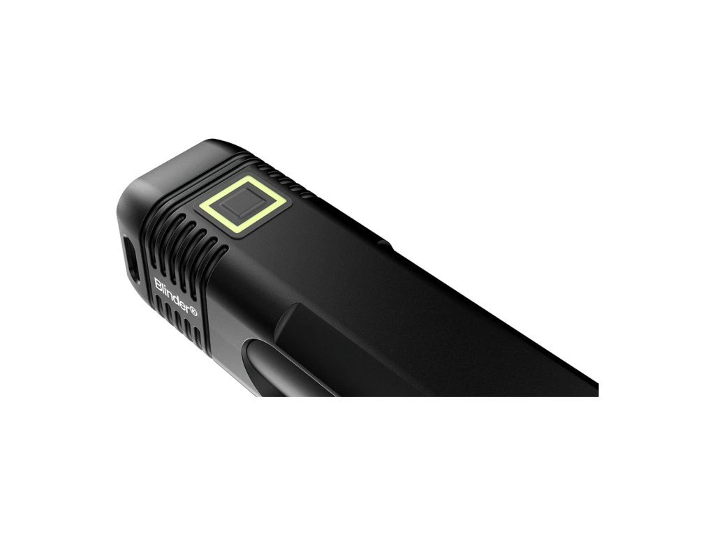 Světlo LED kolem silikonového tlačítka Blinder s měkkým dotykem umožňuje rychle zjistit zbývající nabití a stav nabíjení. Rychlým stisknutím vypnutého tlačítka se zobrazí zbývající nabití, přičemž zelená barva znamená 100-50 % zbývajícího nabití, žlutá 50-25 % a červená méně než 25 %. Při nabíjení signalizuje žluté blikání, které se po nabití změní na zelené.