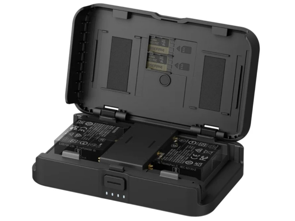 Praktické nabíjení dvou baterií s úložným prostorem pro dvě microSD karty.