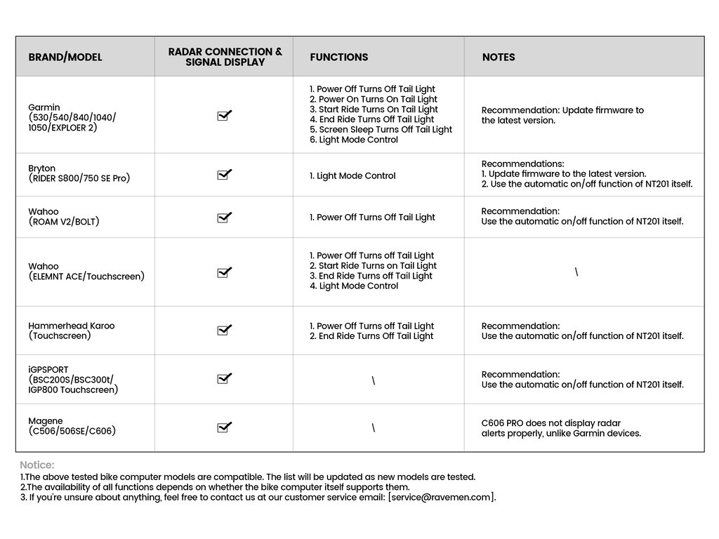Ravemen NT201 – chytré zadní cyklistické světlo s integrovaným radarovým systémem, které zvyšuje bezpečnost jízdy tím, že detekuje vozidla přibližující se zezadu až do cca 140 m a prostřednictvím kompatibilního cyklopočítače (např. Garmin, Wahoo, Hammerhead) poskytuje vizuální a zvuková upozornění. Světlo má maximální jas 80 lm, automatické rozpoznání brzdění, automatické zapnutí/vypnutí, až 23 h výdrže baterie, IPX6 voděodolnost a více režimů osvětlení pro spolehlivou signalizaci za různých podmínek.