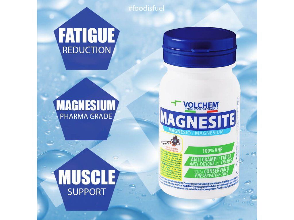 VOLCHEM Magnesite je potravinový doplněk s obsahem hořčíku. Hořčík při sportovní zátěži napomáhá předcházet křečím dolních končetin
