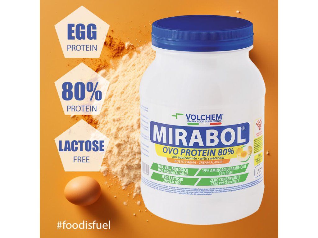 VOLCHEM Mirabol Ovo Protein je vhodnou alternativou k syrovátkovým proteinovým přípravkům.Obsahuje vaječnou bílkovinu získanou velmi šetrnou metodou sušení vaječného bílku. Vaječná bílkovina má velmi vysokou biologickou hodnotu s indexem 100. Pro lidský organismus je tedy velmi hodnotná a obsahuje ideální spektrum aminokyselin.