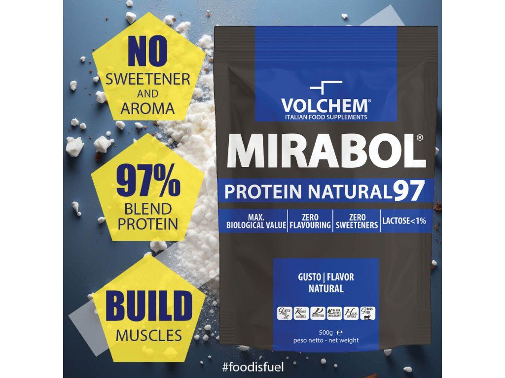 VOLCHEM Mirabol Protein 97 obsahuje kombinaci kaseinu, syrovátkového proteinového izolátu a vaječného proteinu s koncentrací 97 % v sušině. Obsah laktózy je meně než 1 %.