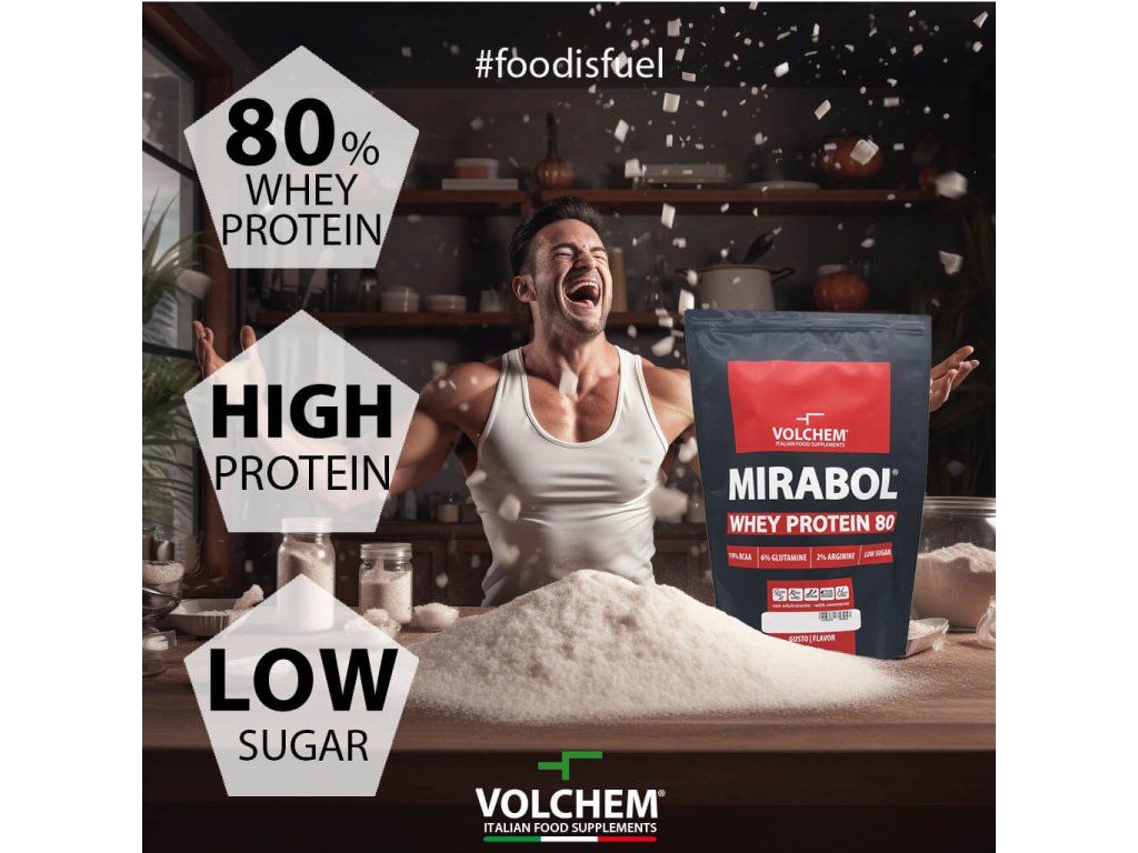 Mirabol Whey Protein 80 obsahuje ultrafiltrovaný syrovátkový protein v koncentraci 75 % ve 100 g produktu a téměř 80 % v sušině. Jedním z ukazatelů kvality je zbytkový obsah laktózy (mléčného cukru), která při filtraci syrovátky zůstane společně s bílkovinou. U doplňků Volchem je tento obsah obecně velmi nízký. Stejně tomu je i v případě Mirabol Whey Proteinu 80.