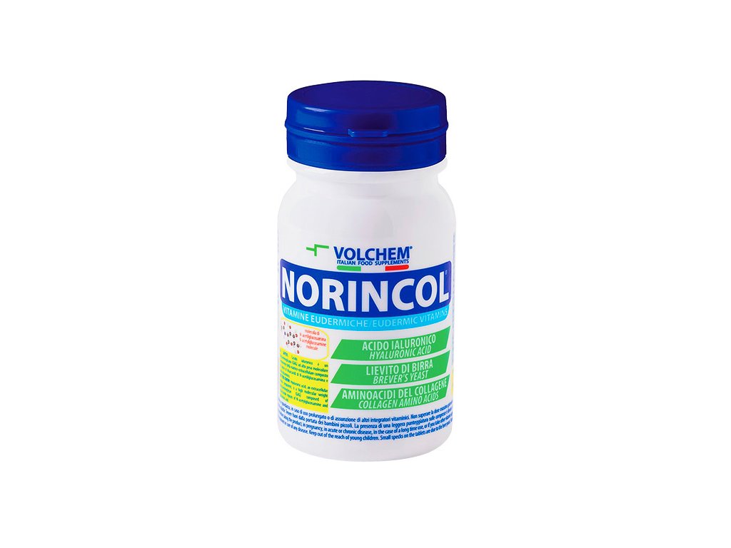 VOLCHEM Norincol obsahuje vitamínový komplex (A, C, niacin, biotin), aminokyseliny Prolin, Lysin a kyselinu Hyaluronovou.