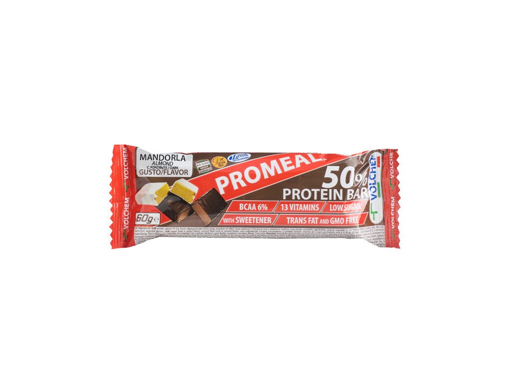 VOLCHEM Promeal Protein Bar 50% obsahuje 30 g bílkovin v každé tyčince a velmi nízký podíl rychlých cukrů. Čokoládová poleva obsahuje 54% kakaa a jako zdroj energie slouží kvalitní rostlinné tuky.